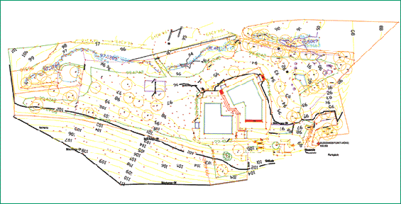 Gelände (Höhenunterschied bis 13 m). Aufgemessen wurde mit zwei Totalstationen. Es wurde der gesamte Bestand (mehrere Schwimmbecken, Gebäude, Parkplätze, Straßen, Wege, Zäune, Ausstattung, Bäume und sonstige Vegetation) digital ermittelt. Als Resultat entstand ein digitales Geländemodell mit sämtlichen Flächeninhalten. Darüber hinaus konnte aus dieser Grundlage ein Bestandsplan mit Meßpunkt-Nummerierung, Höhenkoten, ISO-Höhenlinien und sämtlicher Flächenbezeichnungen in jedem Maßstab erstellt und ausgeplottet werden. Insgesamt wurden ca. 1.600 Meßpunkte aufgenommen. Die Bearbeitungszeit für das örtliche Aufmaß betrug 2 Arbeitstage; für die CAD-Auswertung und Planerstellung 5 Arbeitstage. Die Meßdaten wurden als separate Meßpunkt-Datei ausgelesen; das digitale Geländemodell wurde als Zeichenformat-Datei im DWG bzw. DXF-Format zur weiteren Bearbeitung dem Architekten übergeben. Der Planer erstellt nun in dieses digitale Geländemodell hinein seine Neuplanung einschließlich Flächenberechnung und Absteckvermassung. Der selbe Plan wird nun zum Ausführungs- und Absteckplan. Selbst Planschnitte können zur Erstellung von digitalen Detailplänen aus dem Plan abgegriffen und erstellt werden. Vorab können aufgrund der aufgemessenen Daten die genauen Erdmassenbewegungen berechnet werden, sodaß möglichst wenig Erdmassen auf die Deponie abgefahren werden müssen und so die Kosten erheblich gesenkt werden können. Nach Fertigstellung der Arbeiten kann mittels dieses Uraufmaßes automatisch die Mengen- und Massenermittlung für die Schlußrechnung erfolgen. |
